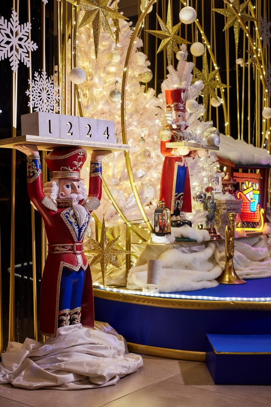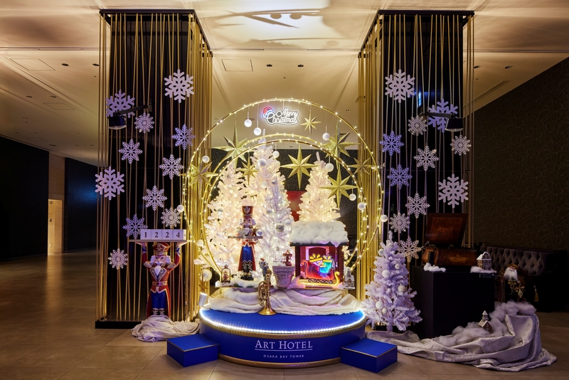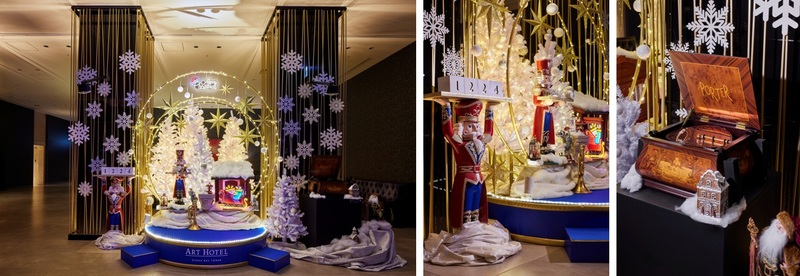 青・水色・ネイビー・白をメインカラーに、アイアンアーチとネオンサインを組み合わせ、スノードームの中に静かに広がる幻想的な冬のひとときをイメージしています。台座にはホテルのロゴをあしらい、中央には雪化粧を施したツリーや雪の玉、星などを飾り、おとぎ話を思わせる“くるみ割り人形”を配置。うち1体には日付を表すサイコロ型の積み木を持たせ、思い出に残る一枚をお撮りいただけるよう遊び心を添えています。さらに、プロジェクターが映し出す舞い落ちる雪の光や、大型オルゴールが奏でるクリスマスソングが、どこか懐かしく心温まる冬の物語を紡ぎます。