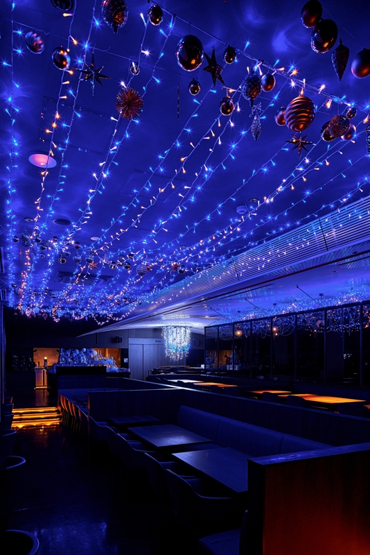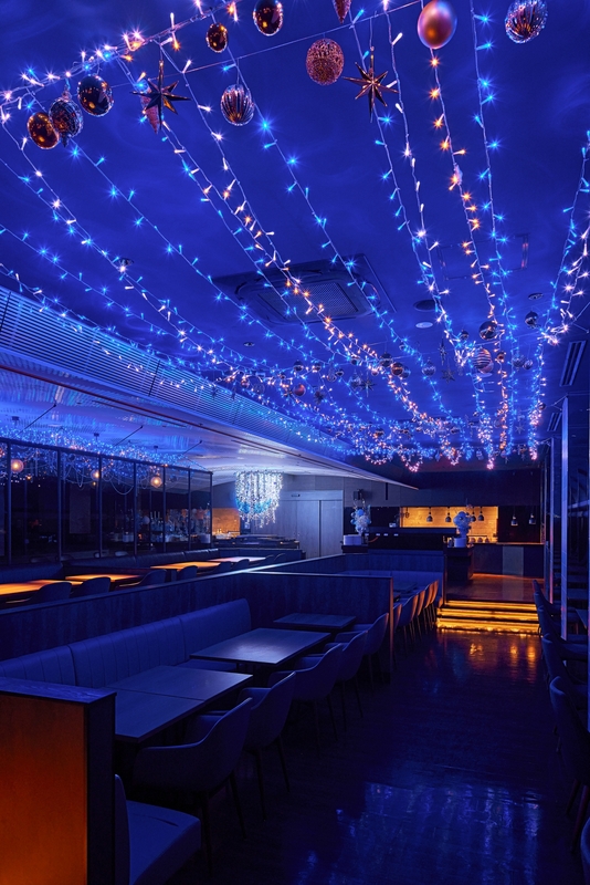 地上200mに位置し、絶景を一望するレストラン「スカイビュッフェ51」でのイルミネーションビュッフェは、弁天町の冬の風物詩として毎年多くのお客様にご好評をいただいております。第3弾となる今回は、Z世代を中心にSNSで話題の“ウィッシュコア”の世界観に着目し、羽を休めた天使たちが開く、きらめくパーティー会場をイメージしました。青・黄・紫を基調にした約10,000球のイルミネーションが輝く店内には、羽や星、月のモチーフ、そして大小のミラーボールが点在し、まるで夜空に星々が瞬くような光に包まれます。中央のビュッフェコーナー上には、光の雨を纏わせたような逆三角形のオブジェと、天使の羽をかたどったLEDライトがきらきらと重なり合い、空間全体を象徴するアイコニックな光のオブジェとして存在感を放ちます。さらにスイーツコーナーには、雲の上にいるかのようなふわふわとした装飾や、天使たちのパーティーを思わせるきらびやかな小物を配し、幻想的で心ときめく世界観を演出しています。