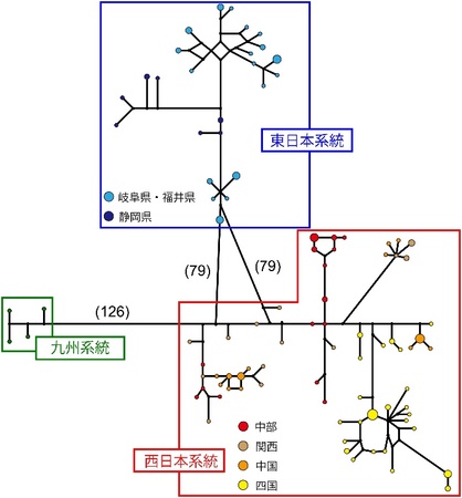 着色された円はハプロタイプおよびその採集地域を示す。線上の数値はハプロタイプ間の変異塩基数を示す。西日本系統・東日本系統・九州系統はいずれも明確に分化している。
