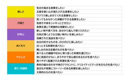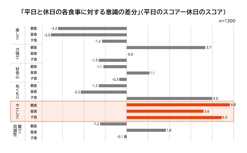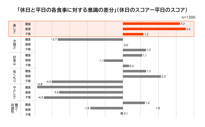 さらに、本調査では、「食事をするタイミングによって料理に求める価値が異なる傾向」が見られました。仕事や学業に追われる平日の食事には「やさしさ」が求められ、忙しない日々の中でも、体と心をいたわりたい様子がみられました。一方で、休日は平日とは違い、心躍る「楽しさ」「ワクワク」といった高揚感を求めており、食体験の中で自分の好奇心を満たそうという様子がみられました。