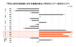 ● 休日の食事は「気分が高まる食事をしたい」「五感を使い心が満たされる食事をしたい」「ワクワク楽しませてくれる食事をしたい」といった“楽しさ”に関する項目が、平日の食事よりも高い傾向にある。休日の朝食は平日に比べて3.2ポイント、昼食は休日3.5ポイント、夕食は1.2ポイント高かった。【図表10】