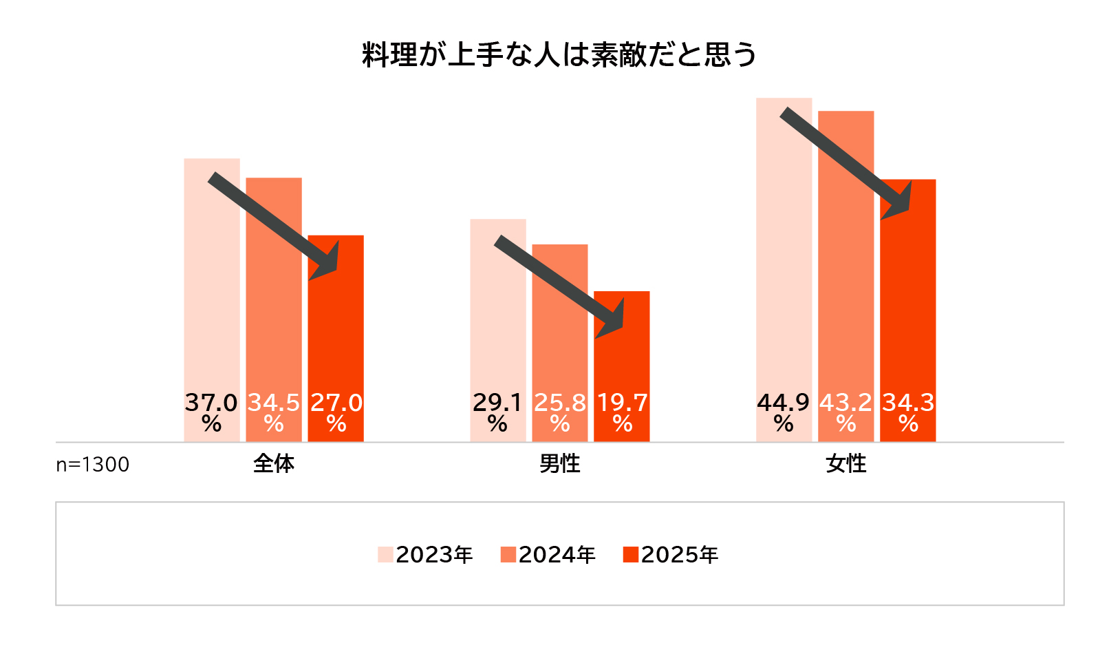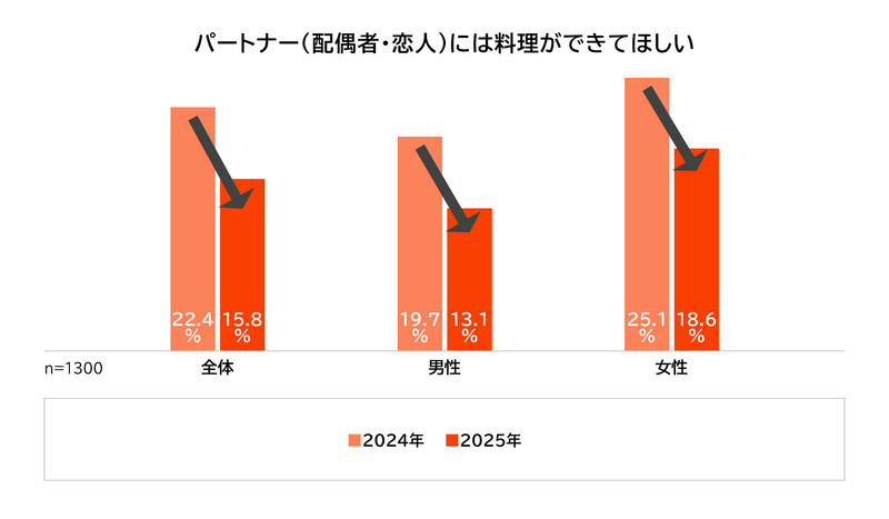 「パートナー(配偶者・恋人)には料理ができてほしい」と考える人は昨年比3割減少
