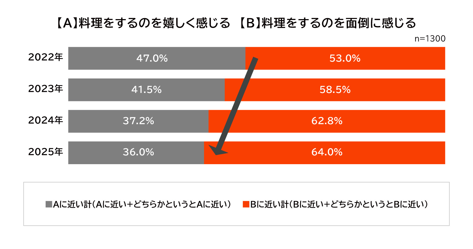 ● 料理をするのを面倒に感じる人(「B(料理をするのを面倒に感じる)に近い」「どちらかというとBに近い」の合計)は64.0%。2022年(53.0%)、2023年(58.5%)、2024年(62.8%)と、直近4年間で増加傾向。【図表3】