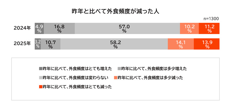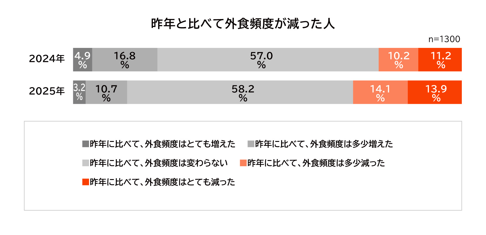 ● 外食する頻度が昨年より減少した人(「昨年に比べて、外食頻度は多少減った」「昨年に比べて、外食頻度はとても減った」の合計)は21.3%。2024年から6.7ポイント増加(21.3%→28.0%)。【図表5】