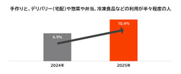 ● 「手作りと、デリバリー(宅配)や惣菜や弁当、冷凍食品などの利用が半々程度」の人は、10.4% 2024年から3.5ポイント増加(6.9%→10.4%)。【図表7】