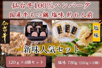 最高5ランクの仙台牛を100%使用したこだわりのハンバーグと、大人気商品の国産牛もつ鍋塩味のセットです。
