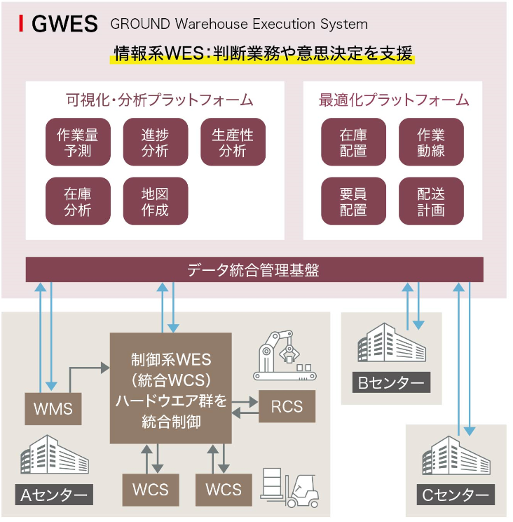 「GWES」は、GROUNDが独自に開発した物流施設向けのオペレーティングシステムです。物流施設内の作業進捗・生産性・在庫情報をリアルタイムに可視化し、データを一元管理することで、庫内業務の自動化・効率化を図り、オペレーションを最適化。また、AIと数理最適化技術により、作業量予測・要員配置・在庫配置・動線計画などをリアルタイムに最適化します。これにより、属人的な判断に依存しない業務運営が可能となり、生産性の向上が期待できます。
