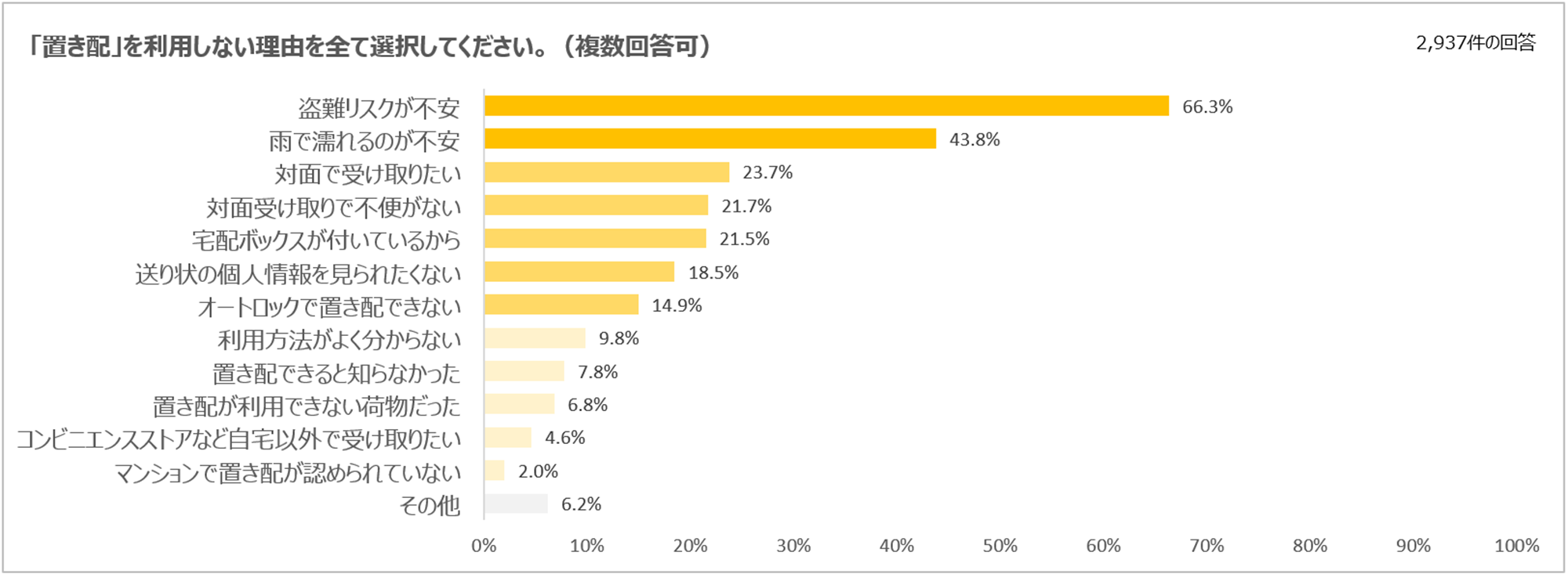 ヤマト運輸に限らず置き配を利用したことがない方の「置き配を利用しない理由」の1位は、2年連続で「盗難リスクが不安」(66.3%)でした。続いて「雨で濡れるのが不安」(43.8%)、「対面で受け取りたい」(23.7%)などの理由が続きました。