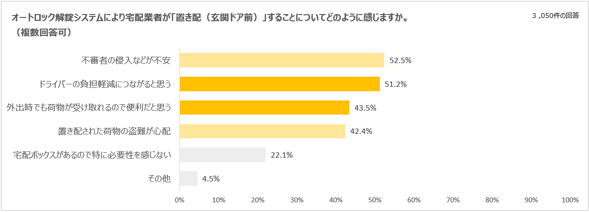 オートロック付きマンションにお住まいの方に、「オートロック解錠システムにより宅配業者が置き配(玄関ドア前)することについてどのように感じますか」という質問をした結果、「不審者の侵入などが不安」(52.5%)、「置き配された荷物の盗難が心配」(42.4%)などの懸念の声が半数程度寄せられた一方で、「ドライバーの負担軽減につながると思う」(51.2%)、「外出時でも荷物が受け取れるので便利だと思う」(43.5%)という賛同の声も半数程度ありました。