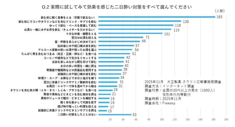 二日酔いの経験者に「実際に効果を感じた二日酔い対策」を聞いたところ、「飲む前に軽く食事を取る(空腹で飲まない)」(183人)、「飲む前にウコンやタウリンなどを含むドリンクやサプリを飲む」(130人)、「ゆっくり飲む・ペースを意識して飲む」(118人)、「お酒と一緒に水やお茶を飲む(チェイサーを欠かさない)」(115人)、「十分な休養・睡眠を取る」(101人)といった対策をしている方が多くいました。
