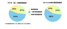 次に、これらの細胞の性質を調査した結果、間葉系幹細胞【※1】に由来する脂肪前駆細胞【※2】であることが明らかになりました。細胞は、分化誘導の刺激に応答して成熟した脂肪細胞へと変化し、細胞内に脂肪滴を大量に蓄積しました(図1)。さらに、培養液に脂肪酸の一種であるオレイン酸を添加すると、細胞の増殖を維持したまま、効率的に脂肪を蓄積させることにも成功しました。市販の養殖ウナギ肉の脂肪酸組成は一価不飽和脂肪酸が最も多く、次いで飽和脂肪酸、多価不飽和脂肪酸の順です。蓄積された脂質の脂肪酸組成は、それと非常に近いものであることが確認されました(図2)。