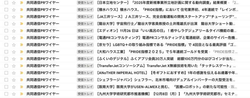 メール件名には先頭に「企業・団体名」、続いて内容がひと目で分かるタイトルを添えて配信することで、個々のプレスリリース情報が認識されやすい設計になっています。