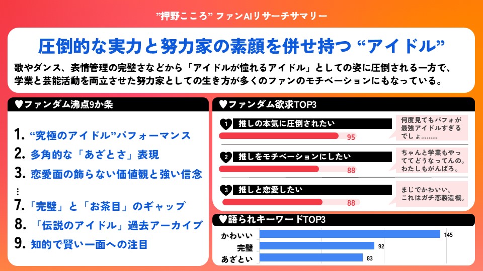 株式会社電通(本社:東京都港区、代表取締役 社長執行役員:佐野 傑、以下「当社」)は、推し活を行うファン層(ファンダム※1)の行動欲求をAIで分析するリサーチツール「ファンAI(アイ)リサーチ 推し活」を開発し、本日より社内で本格運用を開始しました。本ツールは、企業やIP※2ファンの熱量を活用したマーケティングの支援を目的に、当社独自のAI戦略である「AI For Growth」におけるファン領域のプランニング強化・変革支援を推進する「AI For Growth Fan Marketing※3」の活動として設計したものです。ファンダムが持つ「推しのために〇〇したい!」という合理性を超えた行動欲求に着目し、AIを活用することで、その背景にあるインサイトを迅速に可視化・分析します。