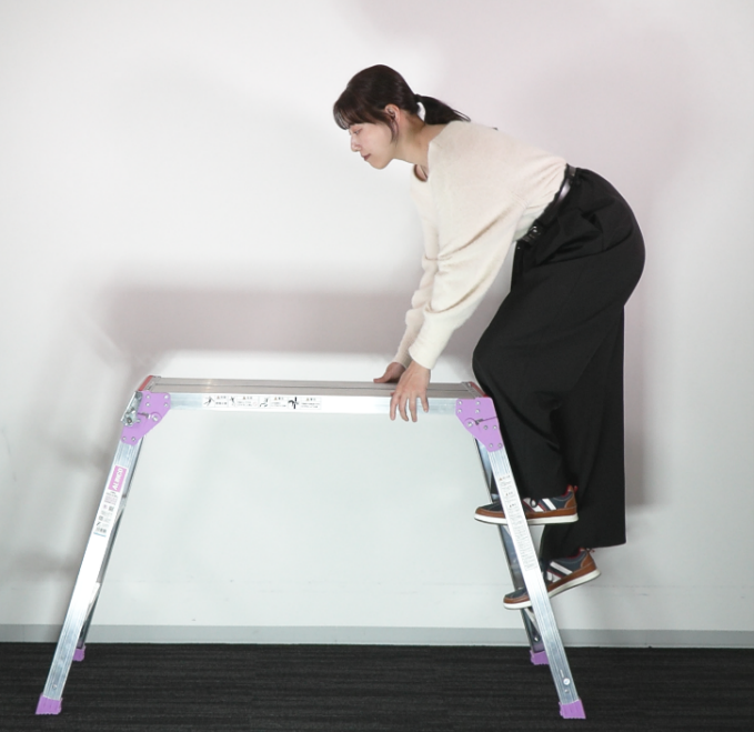 なお、踏み台や足場台の高さが足りず無理な体勢にならざるをえない場合は、より高さのある踏み台や足場台を使用するか、はしごや脚立など、用途に応じたより安全な製品の使用を検討してください。