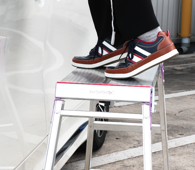 室内で踏み台を使用する際は、スリッパやナイロン製の靴下など滑りやすいものは避け、素足または滑り止め付き靴下で使用してください。屋外で踏み台や足場台を使用する場合は、滑りにくい靴を着用しましょう。