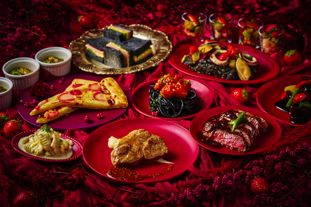 甘酸っぱさと旨みが交差する料理の数々がビュッフェ全体を艶やかに彩ります。いちごの酸味をアクセントにしたポークフリット いちご・バルサミコ風味や、いちごと魚介を合わせたイタリアンマリネ、いちごの甘酸っぱさとイカスミの旨みを掛け合わせたシーフードパエリア風など、テーマに寄り添った遊び心あふれるメニューに加え、冬の食材を使ったロースト野菜のバーニャカウダソースや白身魚とポロネギのヴァプール ブールブランソースなど季節感のある料理も揃えました。ライブキッチンでは、シェフが目の前で焼き上げるアンガス牛ステーキや出来立てのパスタをご提供し、香り立つ臨場感とともにビュッフェの魅力を一層引き立てます。