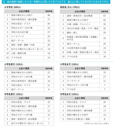 ・小学生は男女とも「家族や親せきとの旅行」、中学生は男女とも「学校の部活・クラブ」に関することが最多。