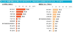 ・小中学生、高校生/大人は4位まで同じで、1位は「わくわく」。続いて「やったー」「うきうき」「どきどき」。小中学生は半数以上が「わくわく」と回答しました。