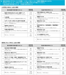 ・高校生/大人の〈自分自身や身の回りのこと〉では「自分自身や家族の健康」が最多。〈社会や世の中のこと〉で最も多かったのは「物価が下がる」ことについてで、昨年よりも回答件数が増えました。