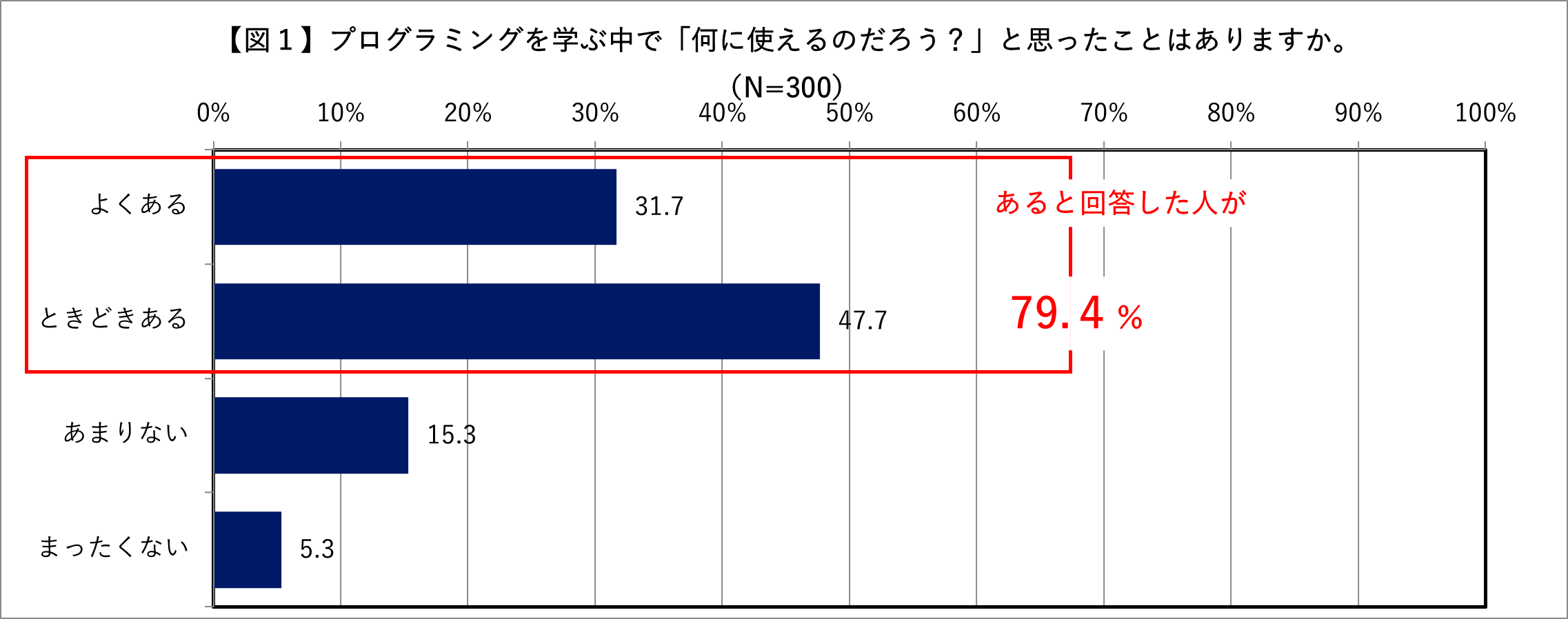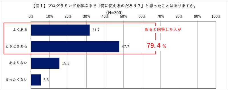 高校生以上の学習者が、プログラミング教育を受けるなかで実用的なイメージを持てているかについて、定量的に把握しました。その結果、学校でプログラミングを学んだものの「何に使えるのだろう?」と思ったことがある人が79.4%(図1)に上っていることがわかりました。