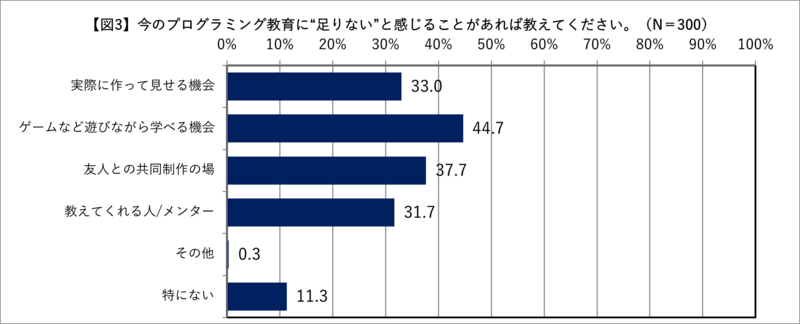 学んだことの定着には、創作や試行の機会を持ち応用していくことが重要になると考えられます。学習者は学校教育や課外活動において、そのような「実践の場」の拡充を求めているか、インサイトやニーズを把握しました。調査の結果「学校や課外活動で“実際に作る・試す”機会が増えてほしい」と回答した人は75.0%(図2)に達していることがわかり、プログラミング教育に“足りない”と感じることの1位は「ゲームなど遊びながら学べる機会」(図3)となり、学びと遊びの融合が、若年層の探究心を引き出す鍵となっていることが示唆されました。