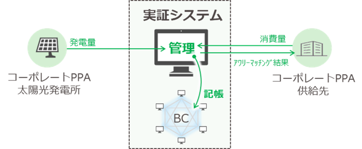 本実証では、コーポレートPPA※1による再エネ設備による発電データと需要場所での電力消費データを活用し、発電データと電力消費データを1時間単位で照合し、データの改ざんが困難なブロックチェーン上で管理することで、発電された再エネ電力がリアルタイムで消費されていることを証明します。