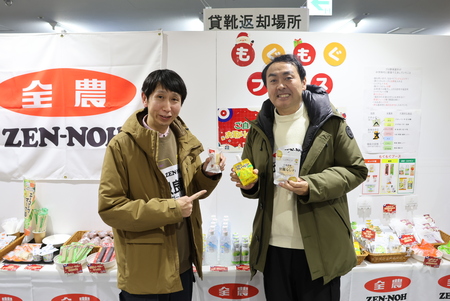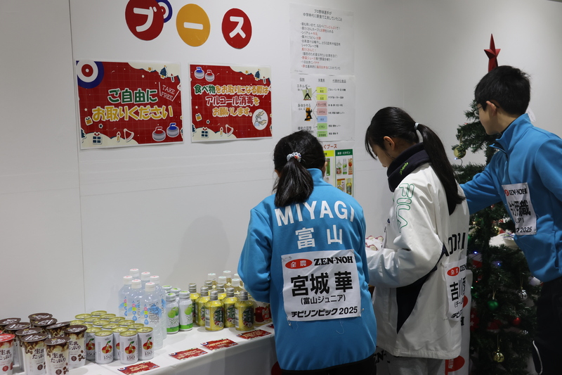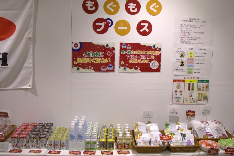 会場では、試合前後でのエネルギー補給用に、全農ブランド商品などを提供する「もぐもぐブース」を設置。ニッポンエール商品や農協シリーズを始め、本会が原料供給している「赤飯おこわ」、「豆腐スイーツバー」や飲料などを揃えました。前日のスポーツ栄養教室でも講義した、試合前後におすすめの食材に関するチラシを掲出し、それを参考に選手は食材を選んでいました。