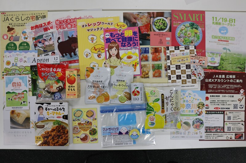 キーマカレー、赤飯おこわ、包装餅、白玉粉、豆腐スイーツバー「チョコ」「抹茶あずき」、豆乳、エーコープ たまごスープ、もちレシピ本「ハレの日にはもちを」、冊子「国産大豆のある暮らし」、Apron12月号など |
