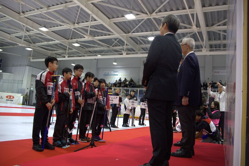 開会式では全農の参事 小池克佳より「もぐもぐブースなどでしっかりと栄養補給をして頑張ってください」と選手を激励。また出場チームを代表して前回大会優勝チームの札幌ジュニアが「カーリング精神に則り、戦い抜くことを誓います」と元気よく選手宣誓し、大会が開幕しました。