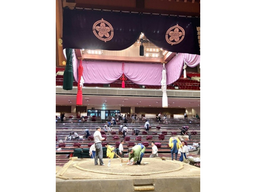 書籍『相撲とデザイン』の中で紹介している化粧まわし職人の長谷川商店(はせがわしょうてん)は、両国国技館の土俵水引幕も製作しています。白い生地を、気品あふれる紫色に染めています。