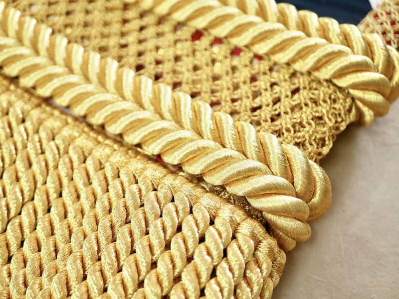 金糸や銀糸で模様を織り出している。化粧まわし(前垂れ)の裏側に縫い付けられているため、力士が化粧まわしを締めている状態では見えません。菊の刺繍、金の輝きが豪華で美しいものとなっています。