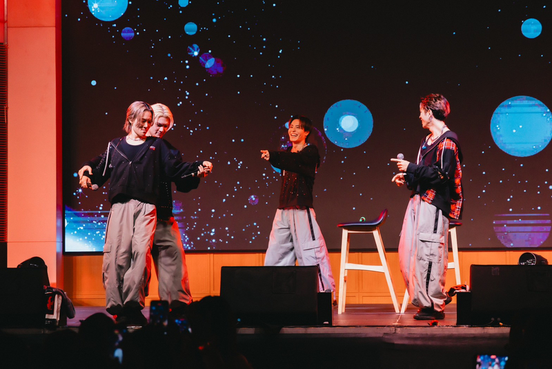 ゲームコーナーでは、椅子取りゲームならぬマイク取りゲームを実施。タイの賑やかな楽曲をBGMに踊りながらマイクの周りを回り、メンバー同士でマイクを取り合う姿に会場は大盛り上がりだった。最後の1人になるまでマイクを取り続けたRYOJIは、賞品として“他のメンバー3人に何でも言える権利”を獲得したが、賞品で「チェンマイに行きたい」とここでもアピール。
