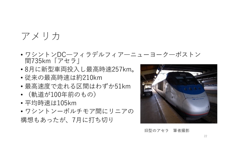 ・アメリカ(北東回廊 ワシントンDC―ボストン):インフラの老朽化により平均時速は150km程度。その他の計画においても、連邦政府による補助金の打ち切りなどの影響多数