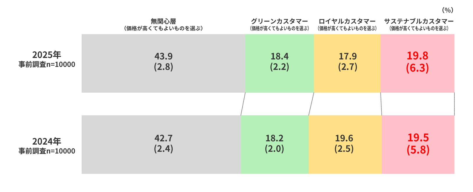 ①サステナブルカスタマーは、全体の約2割(19.8%)を占めており、前回調査(202410月実施)からほぼ横ばい。