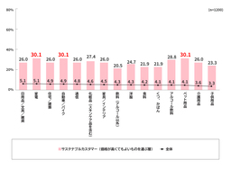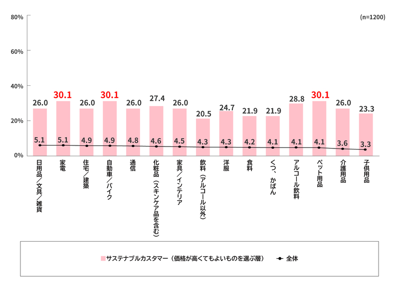 サステナブルカスタマーのうち「価格が高くてもよいものを選ぶ」層は、普段使っている商品より価格が15%以上高くなる場合でも、地球環境への負荷を抑えられる商品に買い替えてもよいと考える人が、全ての品目で全体より15ポイント以上高い。特に、「家電」「自動車・バイク」「ペット用品」では約3割に及ぶ。