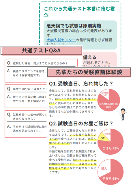 さらに、基本ポイントを解説した「これから共通テスト本番に挑む君へ」、受験直前の過ごし方や学習アドバイス・先輩の体験談など、ここだけの情報をまとめた「共通テスト直前特集」もチェックできます。