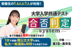 試験後の出願校の決定に役立つ、東進の大学入学共通テスト合否判定システム( https://www.toshin.com/hantei_sys/ )。「共通テスト 全650試験会場のお天気」のサイトからアクセスできます。あわせて活用することで、共通テスト後の出願校決定や学習にも役立ちます。