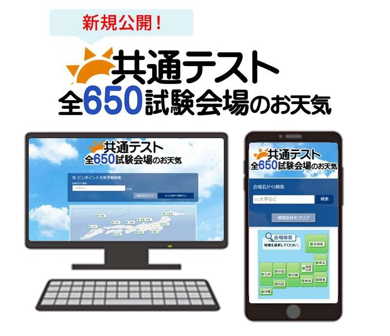 東進ハイスクール・東進衛星予備校(以下、東進)を運営する株式会社ナガセ(本社:東京都武蔵野市 代表取締役社長 永瀬昭幸)は、頑張る受験生を応援するため、「共通テスト 全650試験会場のお天気」サイトを公開しました。大学入学共通テストが実施される2026年1月17日(土)・18日(日)の全650試験会場の天気や気温、服装アドバイス等をまとめた便利サイトです。簡単・スピーディーに最新情報を確認できます。