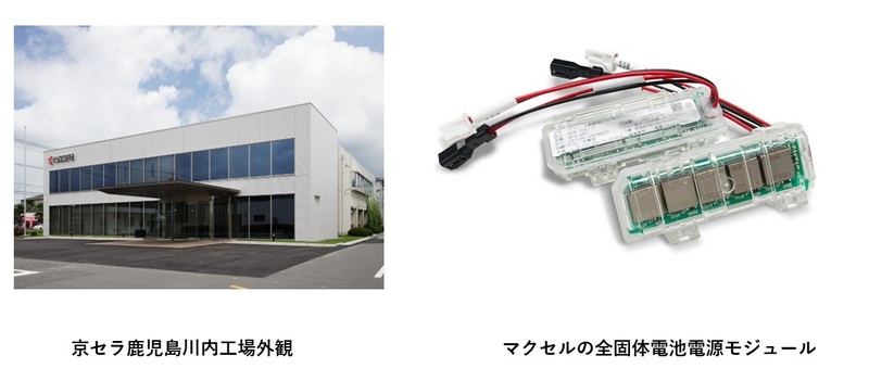 京セラ鹿児島川内工場外観 とマクセルの全固体電池電源モジュール