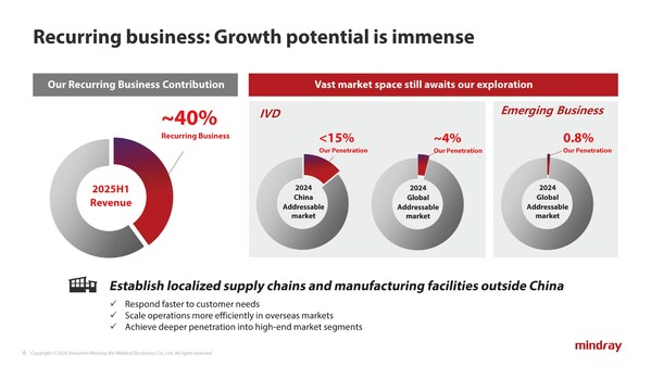 Recurring business, including IVD reagents, high-value consumables, IT solutions, and customer services, already contributed 40% of Mindray's total revenue in the first half of 2025. The company targets lifting this contribution to over 50%, leveraging significant growth potential in underpenetrated markets. In 2024, Mindray held less than 15% market share in China's addressable IVD market and around 4% globally, while its share in the global minimally invasive surgery (MIS) and minimally invasive intervention (MII) markets was only 0.8%.