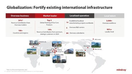 With a 25-year foundation in global business, Mindray has built a robust international infrastructure spanning over 40 countries, including 64 subsidiaries, 5 R&D centers, and 14 manufacturing facilities. Its international workforce has grown to over 3,000 employees, 90% of whom are locally recruited, supporting a 15% compound annual growth rate in international business over the past decade. Currently, international revenue accounts for 50% of the company's total, and Mindray aims to increase this proportion to over 60% through further investment in localization.