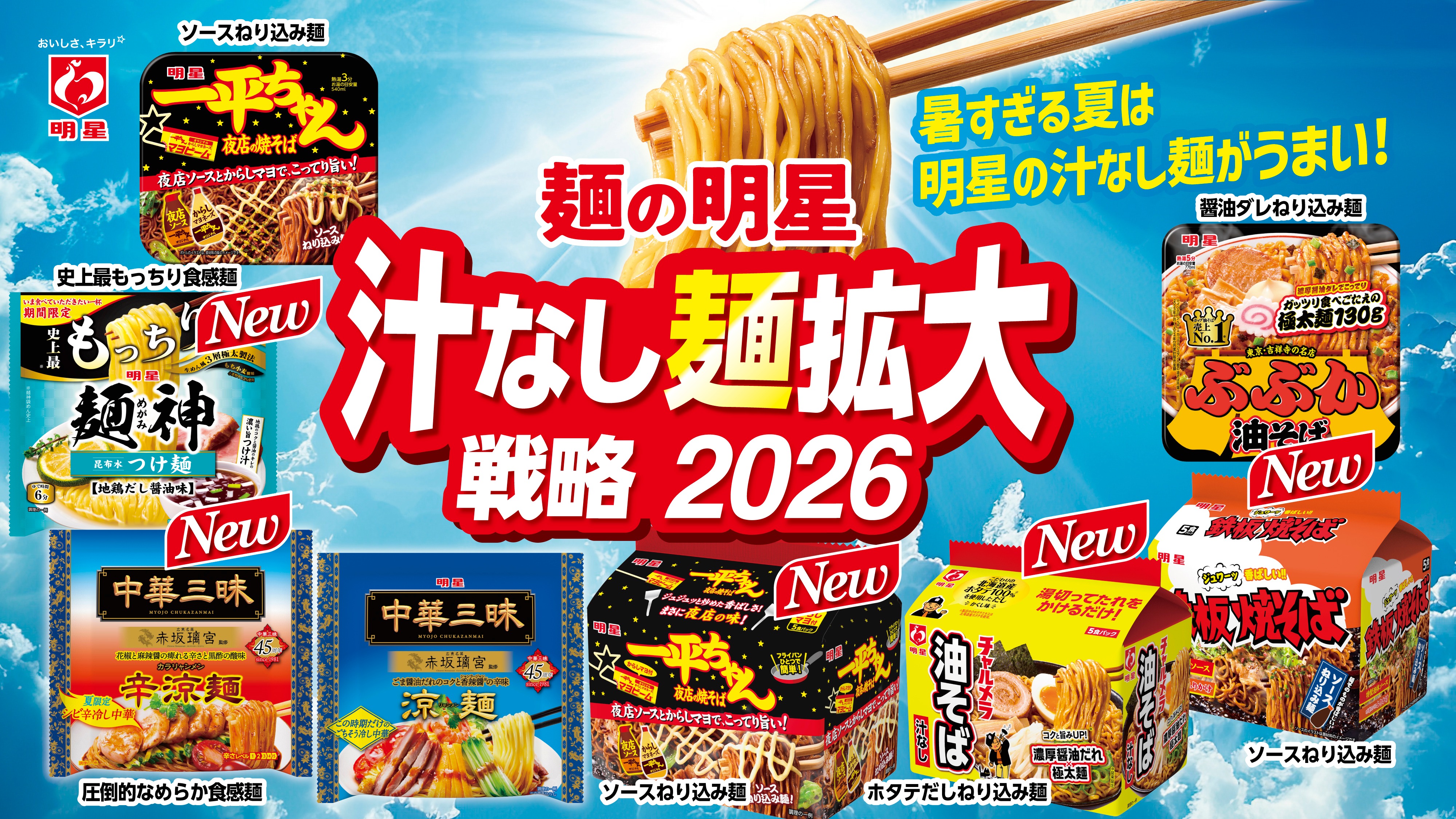 明星食品では2025年より猛暑の長期化を好機と捉え、「明星 一平ちゃん夜店の焼そば」や「明星 ぶぶか油そば」など汁なしカップめんの品質を強化するとともに、新商品も多数発売してまいりました。2026年夏も引き続き猛暑が見込まれることから、好調な汁なしカップめんはもとより、汁なし袋めんにもさらに注力してまいります。「麺の明星」として「麺」を基軸に既存ブランドを強化するほか、「明星 麺神 昆布水つけ麺 地鶏だし醤油味」をはじめとする新商品の投入を通じて、汁なし麺市場の拡大および市場全体のさらなる活性化を目指します。