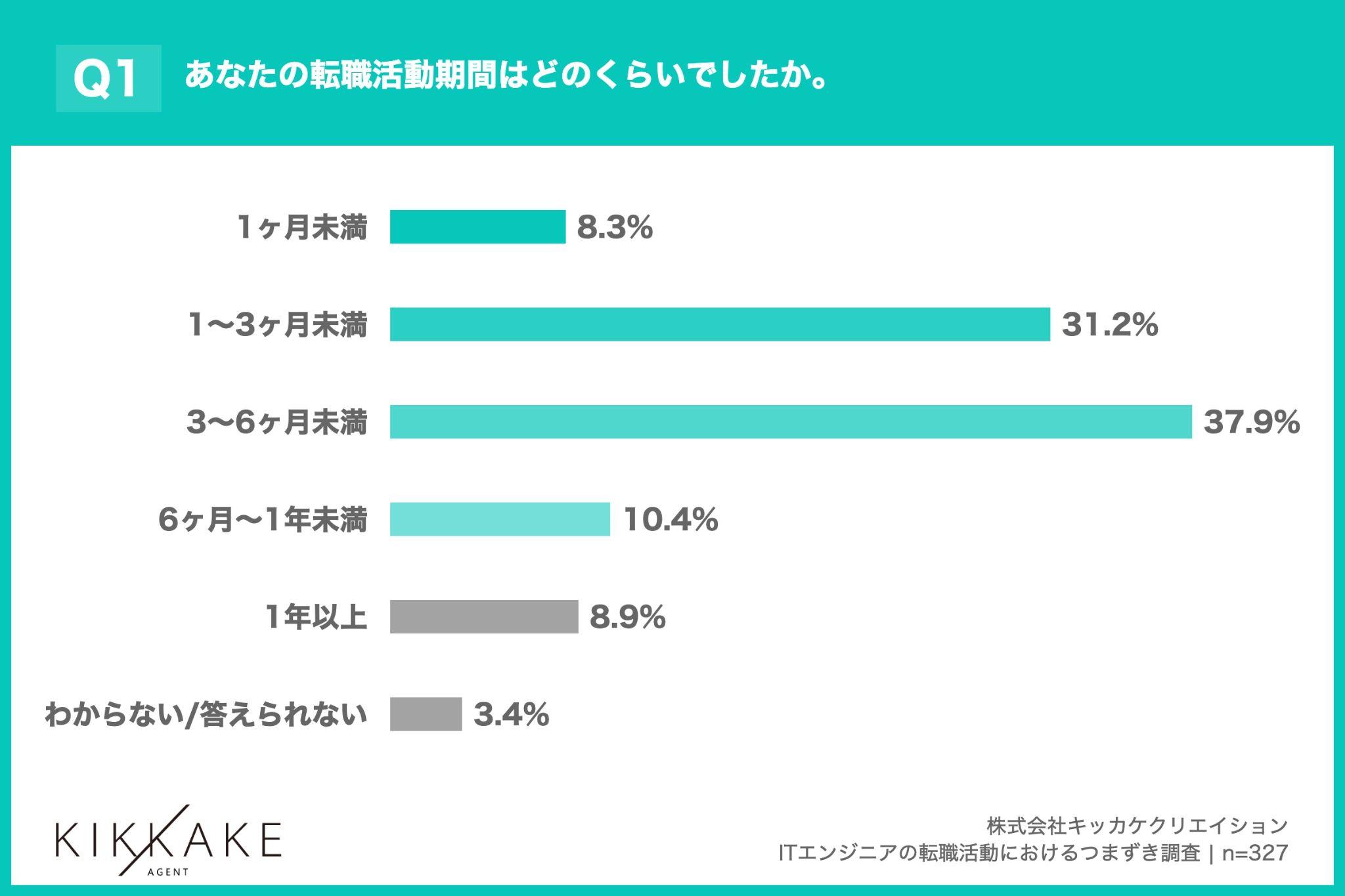 「Q1. あなたの転職活動期間(求人検索開始から入社まで)はどのくらいでしたか。」(n=327)と質問したところ、「1ヶ月未満」が8.3%、「1~3ヶ月未満」が31.2%という回答となりました