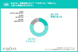 「Q6. あなたは、転職活動において「つまずいた」「失敗した」と感じた経験がありますか。」(n=327)と質問したところ、「非常にあった」が21.1%、「ややあった」が60.2%という回答となりました。