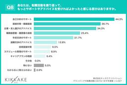 「Q8. あなたは、転職活動を振り返って、もっとサポートやアドバイスを受ければよかったと感じる部分はありますか。(上位3つまで回答可)」(n=327)と質問したところ、「自己分析のサポート」が44.3%、「面接対策・模擬面接」が36.7%、「企業・求人選びのアドバイス」が34.3%という回答となりました。