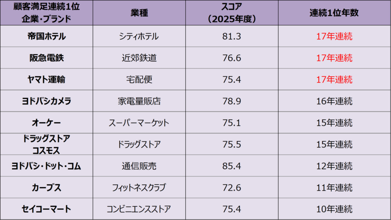 業種別顧客満足 連続1位企業・ブランド