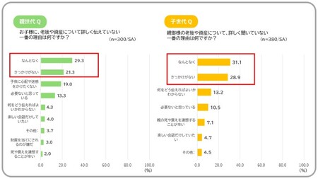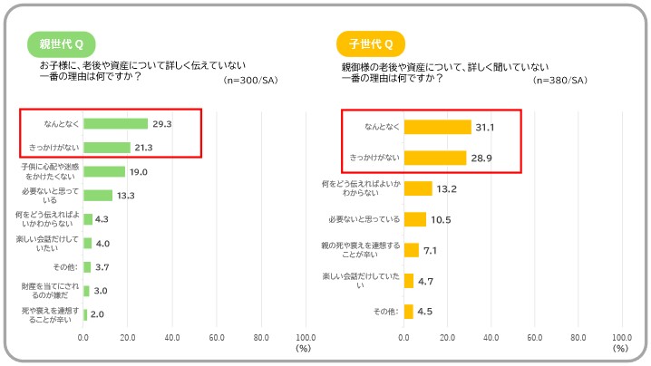 老後や資産について詳しく話していない理由を聞くと、親子ともに「なんとなく(親世代:29.3%、子世代:31.1%)」が最多となりました。次いで「きっかけがない(親世代:21.3%、子世代:28.9%)」、「子供に心配や迷惑をかけたくない(親世代:19.0%)」「何をどう伝えればよいかわからない(子世代:13.2%)」が上位を占めました。