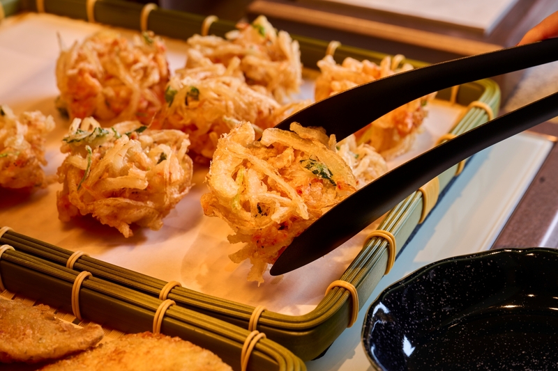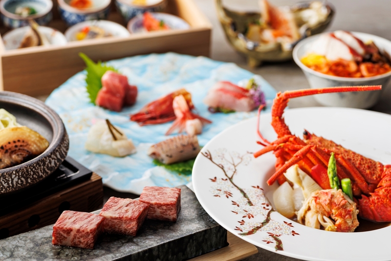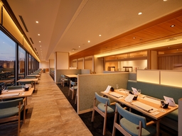 レストランは、大窓から熱海市街地や相模灘を望むダイニングとしてリニューアルしました。時間帯によって表情を変える海の景色を眺めながら食事を楽しめる空間です。夕食では、季節の食材を使用した和食会席料理をご提供、朝食では約60種類の和洋ビュッフェをご用意し、ライブキッチンでは桜えびのかき揚げや鯵フライなど、出来立ての料理をお楽しみいただけます。