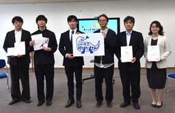キャッチコピー最優秀賞の秋山さん(左から2人目)、ロゴマーク最優秀賞の小島さん(右から2人目)