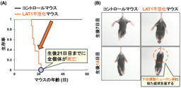研究グループはまず,神経細胞特異的にLAT1を欠損させたマウス(以下,LAT1不活化マウス)を作製しました。作製した遺伝子改変マウスを観察したところ,生後21日目までに全個体が死亡することがわかりました(図1A)。さらに,様々な行動解析試験を実施した結果,LAT1不活化マウスは,生後14日目にFoot clasping reflexを含む,下位運動ニューロン病様の症状を呈することがわかりました(図1B)。